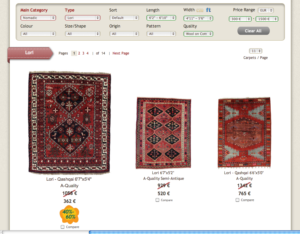 Here is an example to give you a more specified look on the procedure. In this example we are looking for a Nomadic Persian carpet from the family of Lori. The sizes that we used are in inches and are shown in the picture bellow. The cost of the carpet is specified in euros also and we chose a price range between 300 to 1500 euros. Notice that despite the fact that we used only 6 of the 11 tabs on the board it is still enough to give us a efficient search.