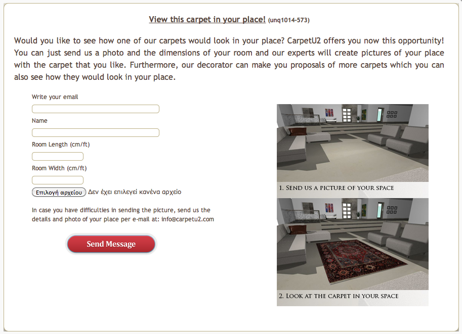 Keep in mind that we will need the actual length that is portrayed in the picture you are going to send us. The reason is that we need to calculate the distances in the picture in order to correctly implement the carpet in scale in your picture.