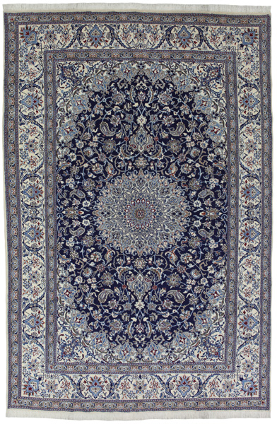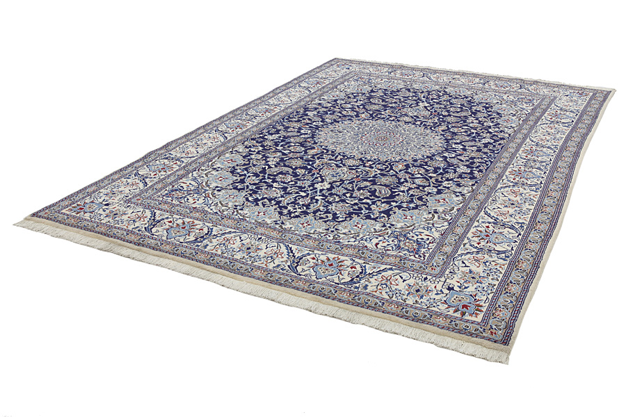 They created their own style using bright, creamy colors and shades of blue or red with a large medallion in the centre. The high knot density and high class materials (wool and silk) establish Nain carpets as very high quality.