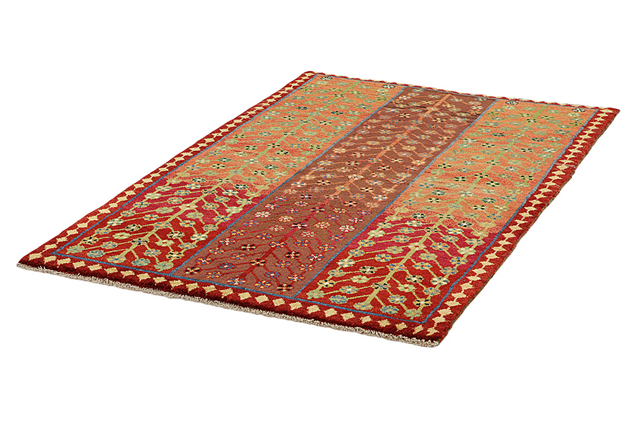 Gabbeh in Farsi means natural, primitive. Carpets and textiles with this name are woven by the nomads Qashqai who roam about, or in villages in Southwestern Iran where they live. The yarns are processed and twisted by hand, painted with herbal colors and woven with a wool warp up to 2 cm thick. These carpets are simple, with few designs, or monochrome. The simple, linear designs with animals and human figures give them a contemporary look.